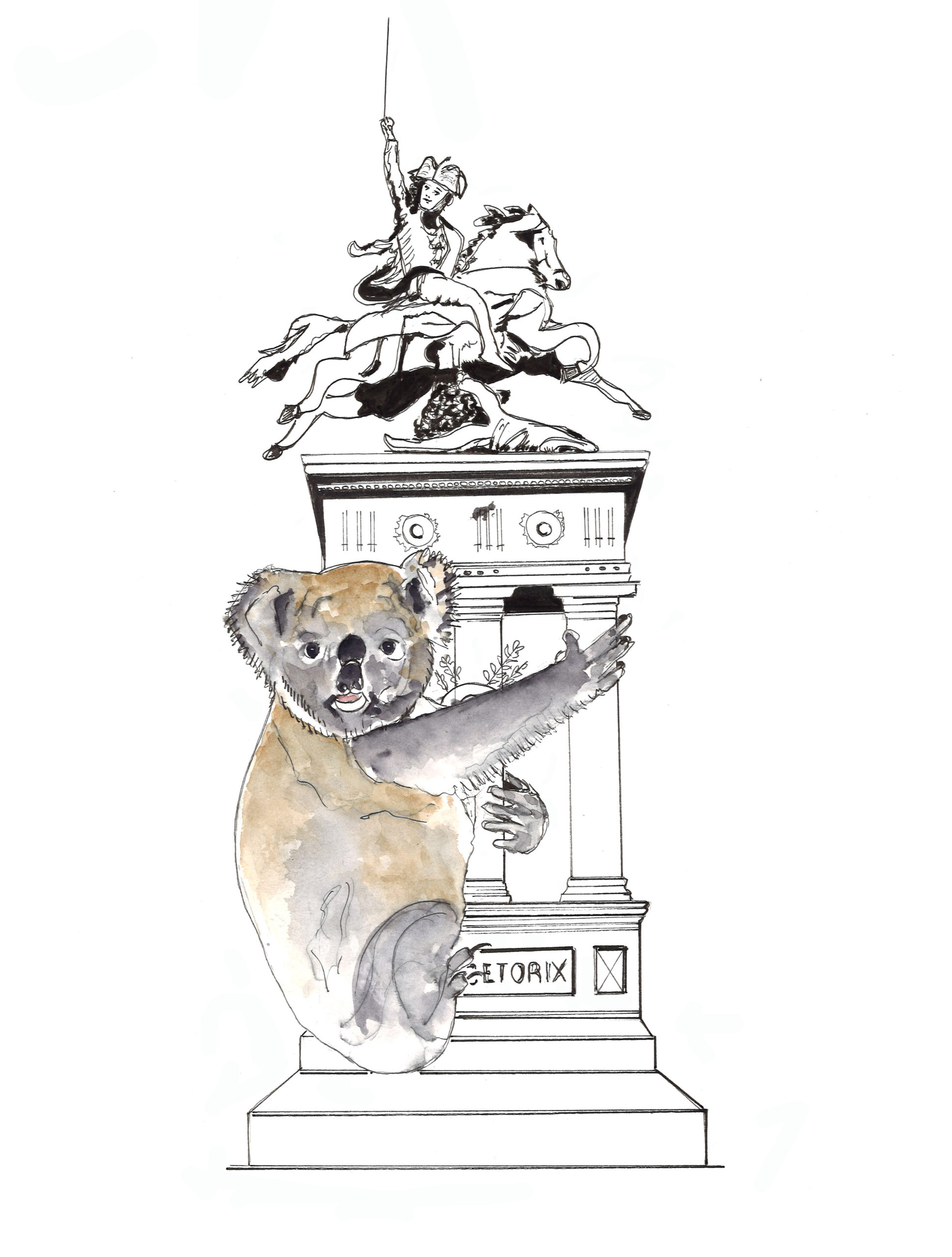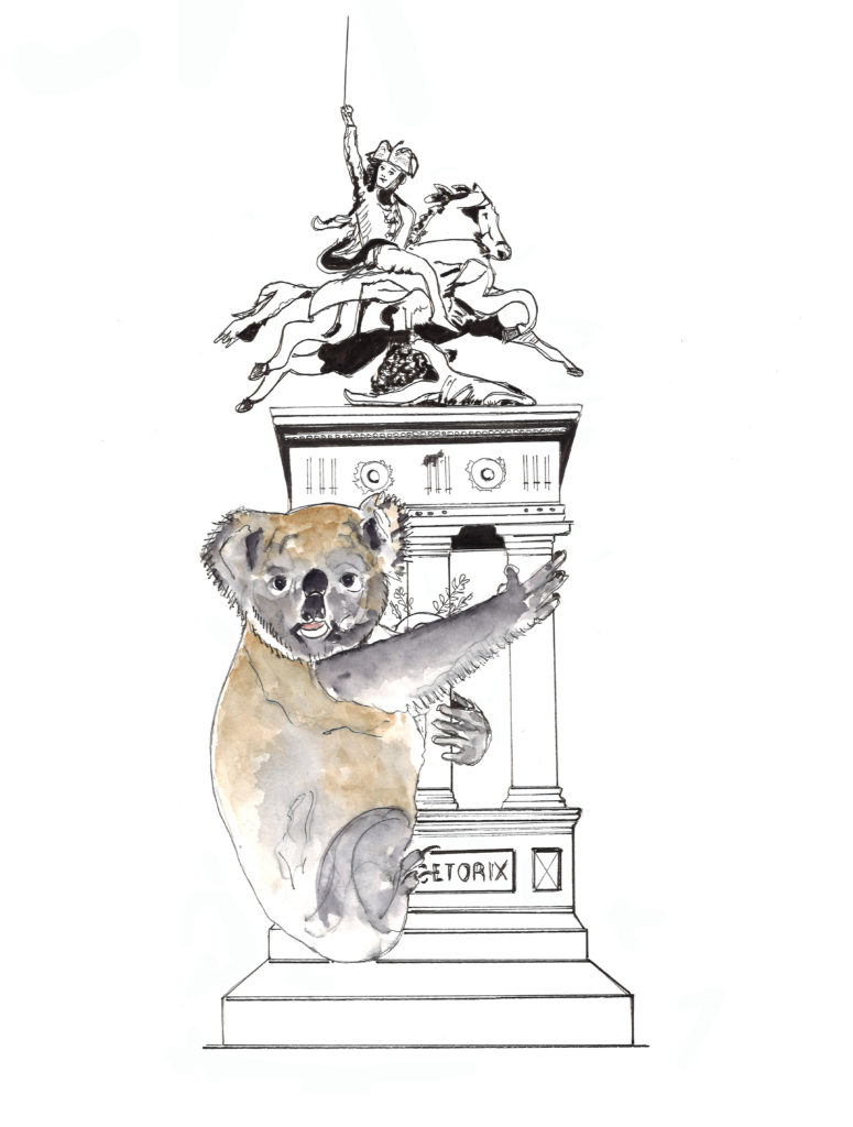 Koala perrché sur la statue de Vercingétorix , place de Jaude à Clermont-Ferrand. Format 30×40 cm, avec passepartout et cadre sous verre 40 x 50 cm