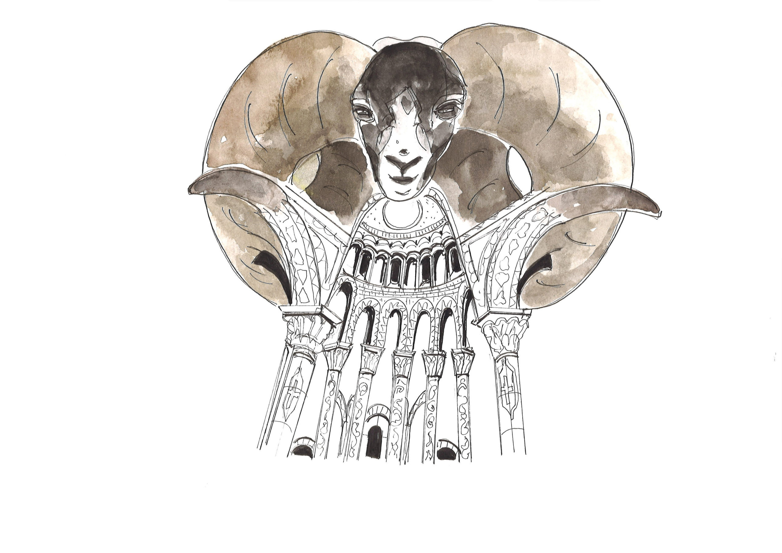 Le bélier d’Issoire Aquarelle format 20 * 30 cm , avec passepartout , cadre sous verre format 30 x 40 cm
