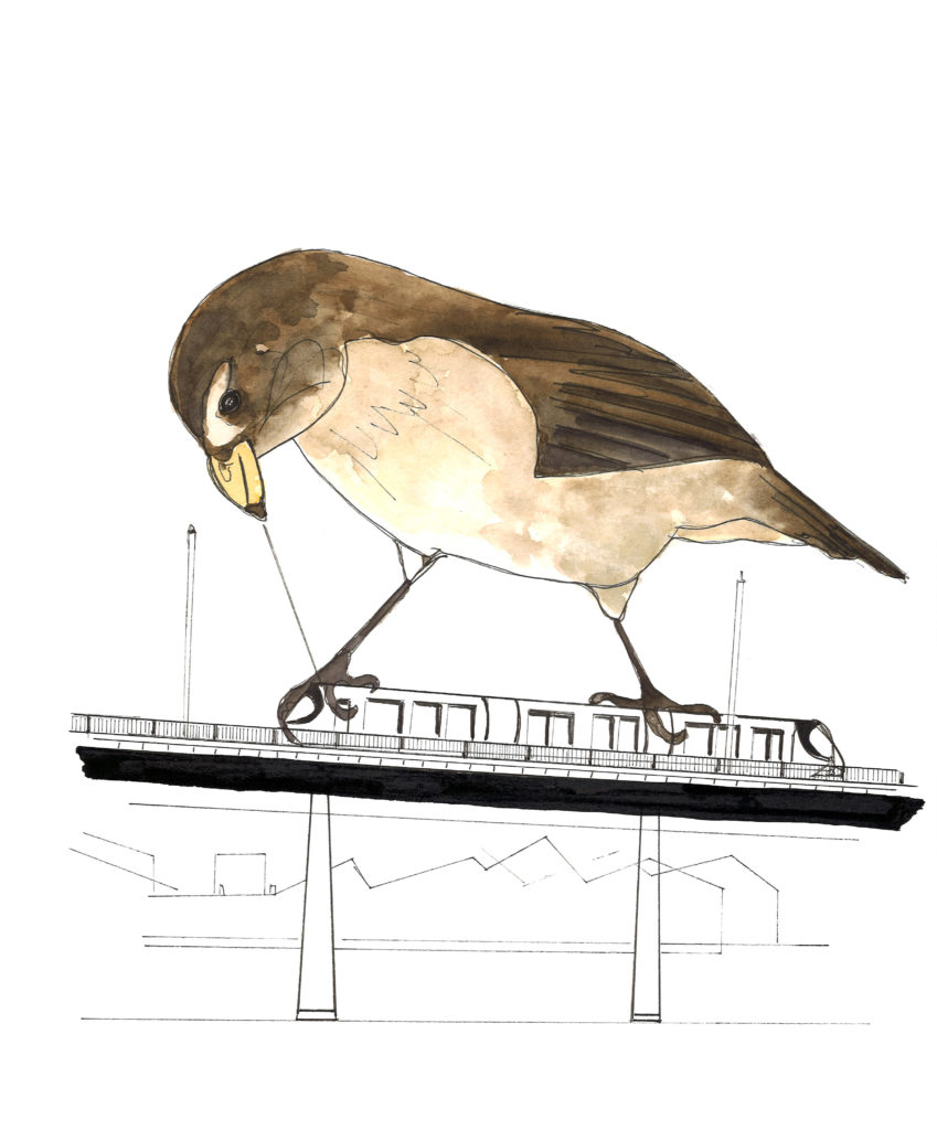 Le moineau surfeur du viaduc Saint-Jacques à Clermont-Ferrand Aquarelle Format 30 x 40 cm , avec paasepartout, cadre sous verre de format 4 0x 50 cm